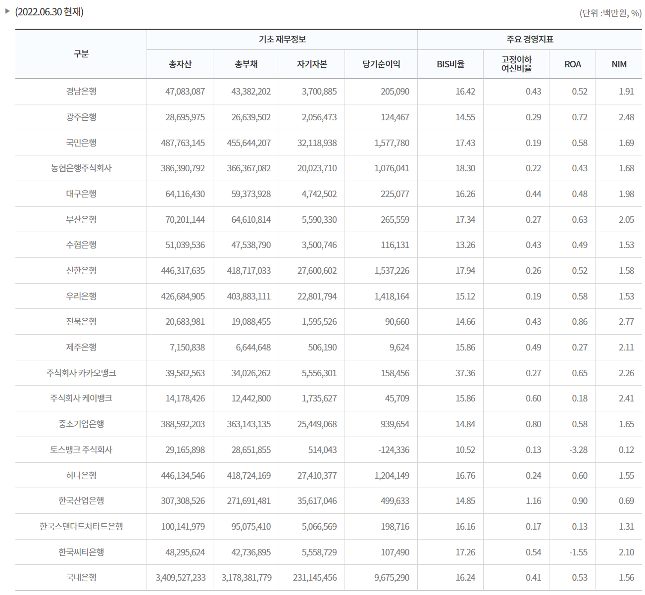 금융회사 핵심경영지표를 통해 안전한 은행을 확인해 보시기 바랍니다.