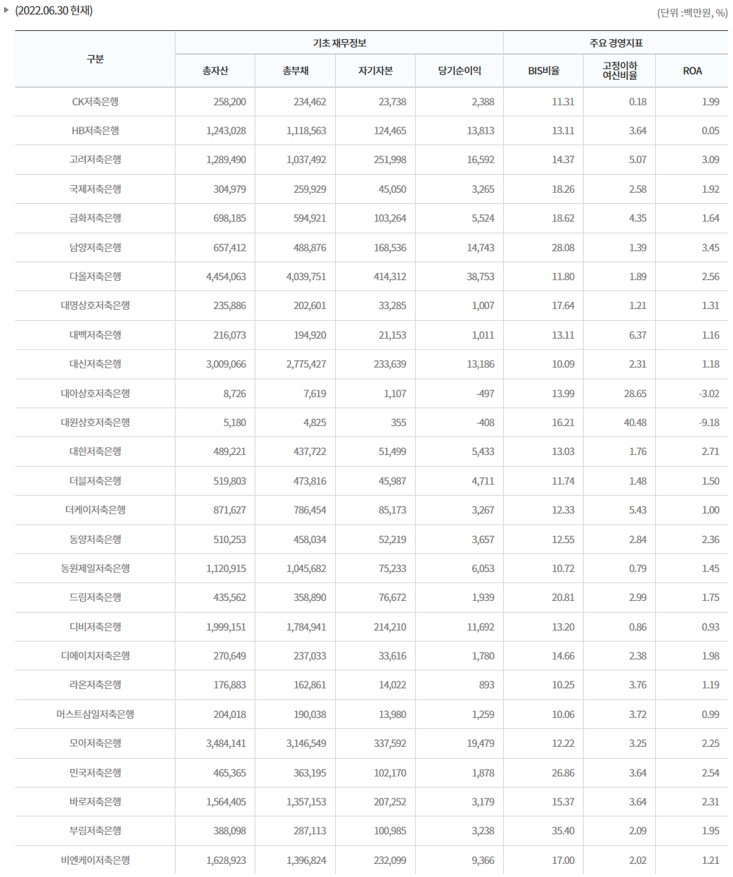 예금보험공사 저축은행 주요재무비율