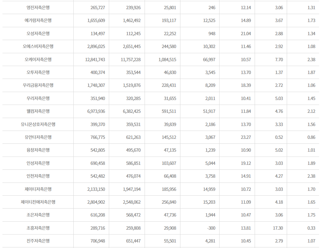 저축은행의 총자산 대비 당기순이익 비율로 은행이 자산을 효율적으로 운용했는지를 알 수 있는 지표입니다.