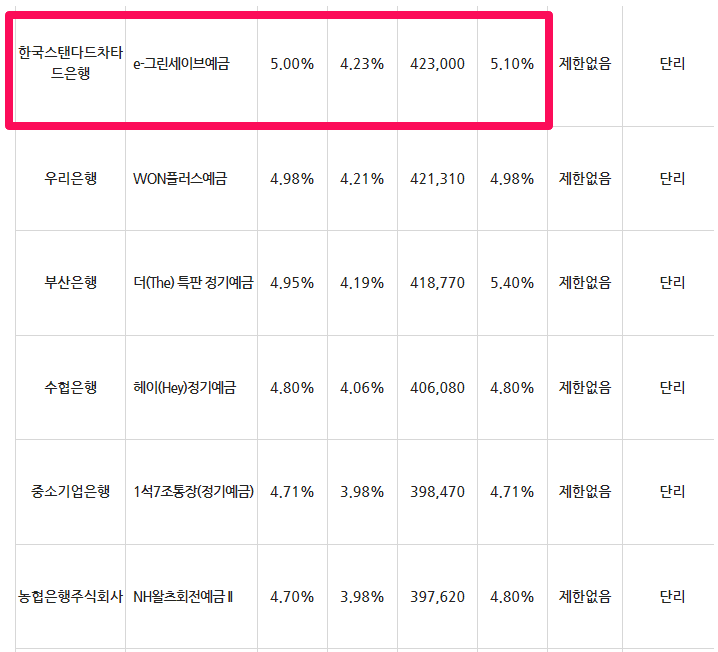 정기예금 이율 높은 곳을 기본금리 순서로 정렬하면 5% 한국스탠다드차타드은행 e-그린세이브예금입니다.