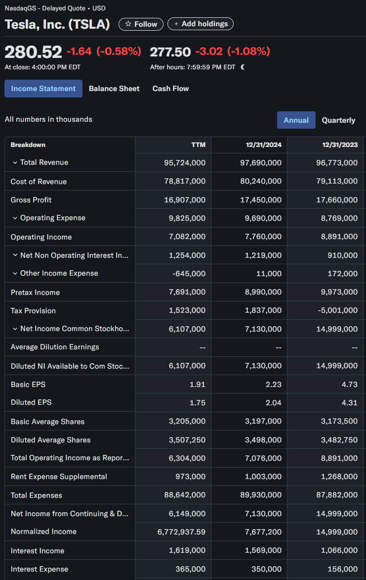 이 데이터를 통해 테슬라가 2024년에 매출은 소폭 증가했으나, 영업이익과 순이익은 크게 감소했음을 알 수 있습니다. 이는 비용 증가나 마진 감소 등의 요인이 있을 수 있습니다.