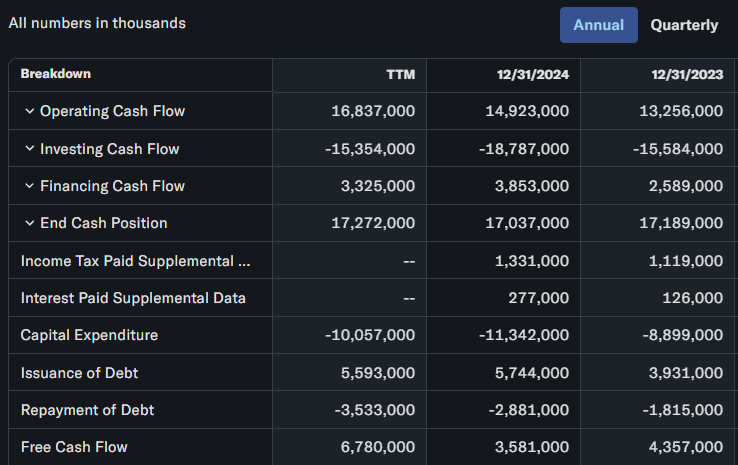 - Operating Cash Flow (영업활동현금흐름) - 16,837,000천 달러로, 테슬라의 주요 사업 활동에서 발생한 현금입니다.