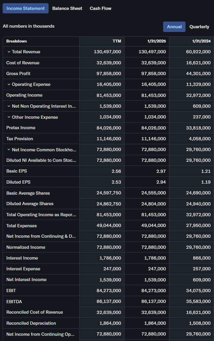 분석 인사이트: NVIDIA의 대차대조표를 살펴보면, 2025년 1월 기준 총자산은 111,601,000천 달러로 전년 대비 약 70% 증가했으며, 부채는 32,274,000천 달러로 약 42% 증가했습니다. 주목할 점은 순부채(Net Debt)가 '--'로 표시되어 있는데, 이는 NVIDIA가 더 이상 순부채가 없다는 의미입니다. 이것은 기업의 재무 건전성이 크게 개선되었음을 나타냅니다.
