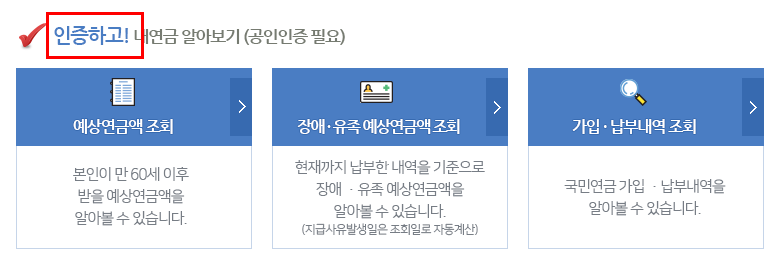 인증없이 간단하게 예상연금도 알아볼 수 있는 방법도 있습니다. 만약 내 나이가 60세 이후가 된 다음 정확한 연금액을 알아보고 싶다고하면 공인인증서로 접속하면 바로 조회 할 수 있습니다.