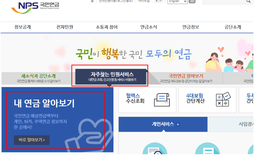 국민연금공단 홈페이지에 들어가면 "자주찾는 민원서비스 -> 내연금 알아보기"로 접속하실 수 있는데, 내가 받을 국민연금 수령액을 한눈에 확인할 수 있습니다.