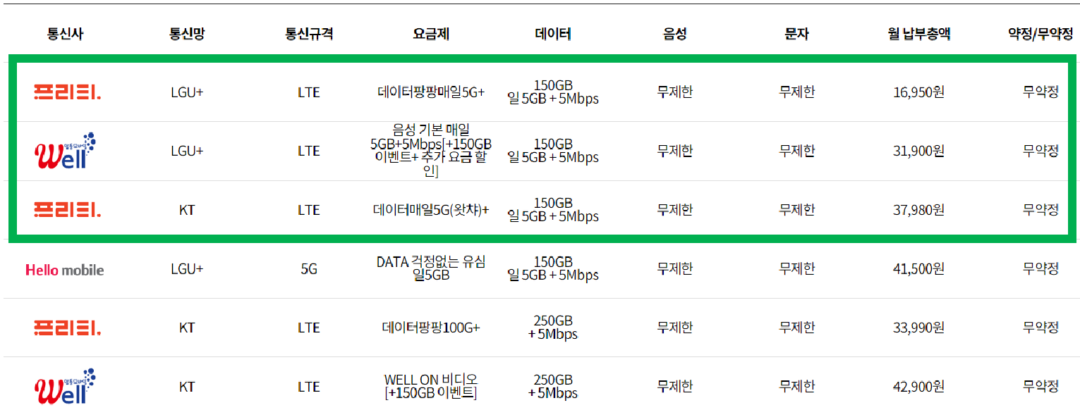 | 통신사 | SKT | 프리티 | 웰 | 프리티 |