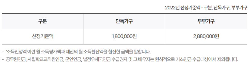공적이전소득: 각종 법령에 따라 정기적으로 지급되는 각종 수당·급여·연금·기타 금품(국민연금, 공무원연금, 군인연금, 사립학교교직원연금, 산재급여 등)이 포함됩니다. 단, 일시적으로 받는 금품은 재산으로 간주됩니다.