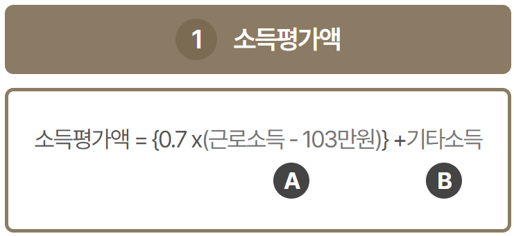 A. 근로소득: 기본공제액인 103만원을 차감한 후 30%를 추가로 공제한 금액이 근로소득으로 인정됩니다. 단, 일용근로소득, 공공일자리소득, 자활근로소득은 근로소득에서 제외됩니다.
