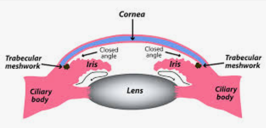 2. 폐쇄각 녹내장(ACG): 폐쇄각 녹내장으로도 알려져 있으며 덜 일반적이지만 더 치료가 시급하고 긴급한 상황입니다. 각막과 홍채 사이의 배수각이 닫히거나 막혀 안압이 급격하게 상승하기 때문입니다.