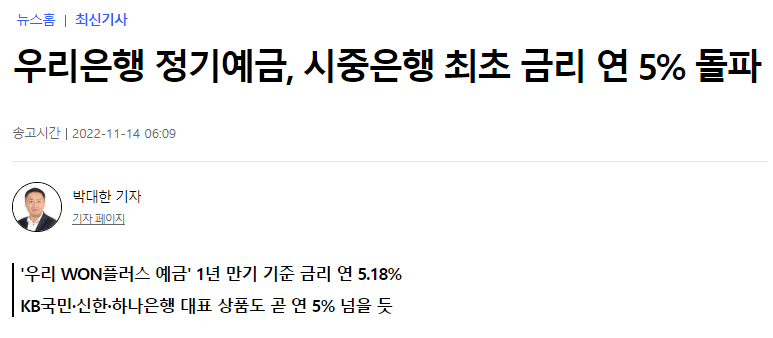 오늘 이런 뉴스가 나왔었는데요, 보시고 어리둥절하신 분들도 있으실 것입니다. 기사 내용을 보니 우리은행의 WON플러스 예금이 시중은행으로서는 처음으로 5% 예금 금리를 넘겼고 현재는 다시 4.98%의 금리를 제공하는 것으로 보입니다. 우리 WON플러스 예금은 시장금리를 반영해 매일 적용금리가 달라지기 때문에 주말 동안 시장 금리 인상 분이 자동 반영되었던 것 같습니다.