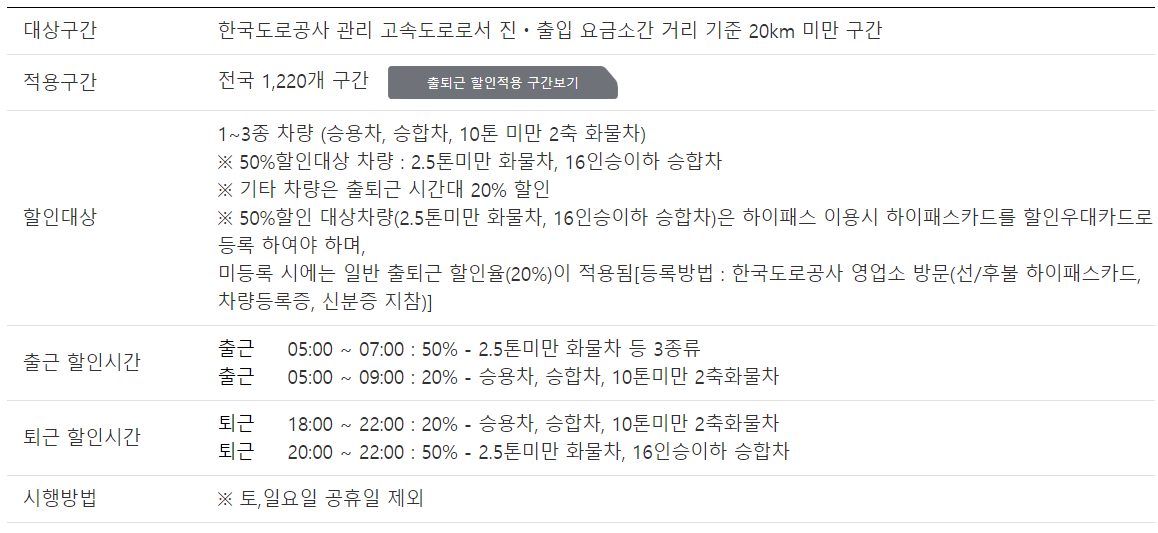 출퇴근 시간대 통행료 할인( 20~50%) - 공휴일 제외 (문의사항 한국도로공사 콜센터 :1644-6500)