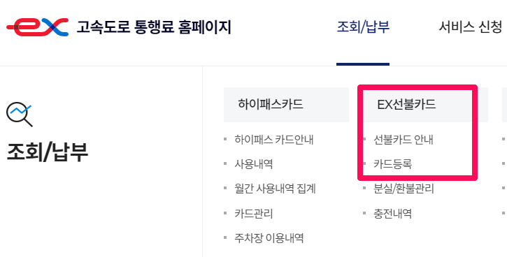 고속도로 통행료 홈페이지에 접속 > 조회/납부 > EX선불카드 > 카드등록