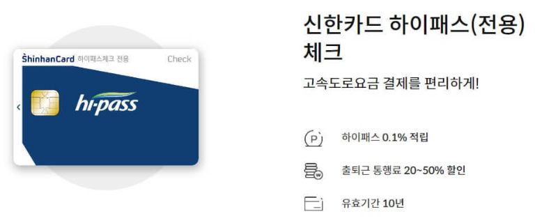 이용 후 2-3일 뒤에 사용 금액이 결제되는 후불 하이패스 카드이며 연회비가 없습니다. 또한 하이패스 이용 금액의 0.1%를 마이신한포인트로 적립할 수 있습니다. 다만, 신한은행 체크카드를 기존에 보유하고 있어야 카드를 추가로 발급 받을 수 있습니다. 또한 연결계좌가 신한은행, 국민은행, 농협, 우리은행으로 한정적입니다.