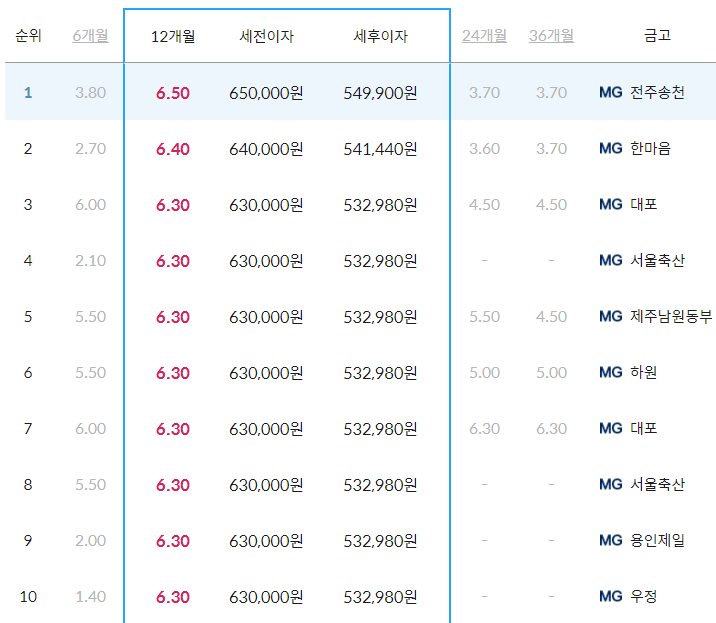 새마을금고 예금금리 가장 높은 곳은 12개월만기 최고 6.5% 전주송천새마을금고입니다.