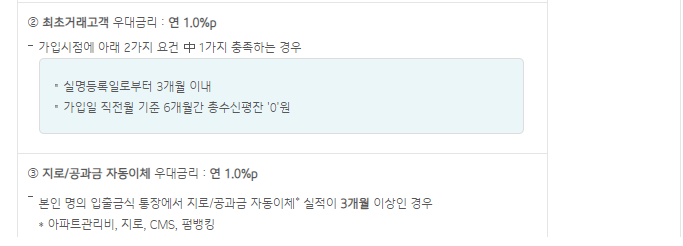 자동이체 등록(0.3%), 마케팅 동의(2.0%) 시 최대 0.5%의 우대금리가 적용되고 다음의 특별 우대금리 최대 7.7%도 적용됩니다.