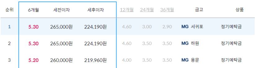 6개월 기준으로는 하원, 서귀포점이 5.3%로 가장 높은 금리를 제공하고 있고, 용문, 남대전 지점이 5.1~5.2%의 금리를 제공하고 있습니다.